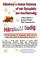 Am Donnschtig, 11.12.2025, ab em halbi sibni (nach äm Samichlous-Bsuech) si Chly u Gross ganz härzlech zu emene Glesli Wiehnachtstee, Glüehwy, Gaffe oder Mineralwasser, herrlechi heissi Hamme mit Züpfe, Hot-dog, Chäsplatte, öppis Süesses uf em Spielplatz am Aschterwäg iglade. Mir fröie üs ganz fescht uf Öire Bsuech. Dir chömet doch ou?