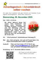 Wir öffnen während dieser Zeit unsere "Villa Kunterbunt" und stellen euch Grünzeug wie Tannäste, Koniferen, Trockenmoos, und das Werkzeug usw. zur Verfügung. Ihr nehmt die Kerzen, Gefässe oder Kränzli und das Dekomaterial selber mit. Gerne helfen wir euch, z.B. zum Befestigen der Kerzen usw.